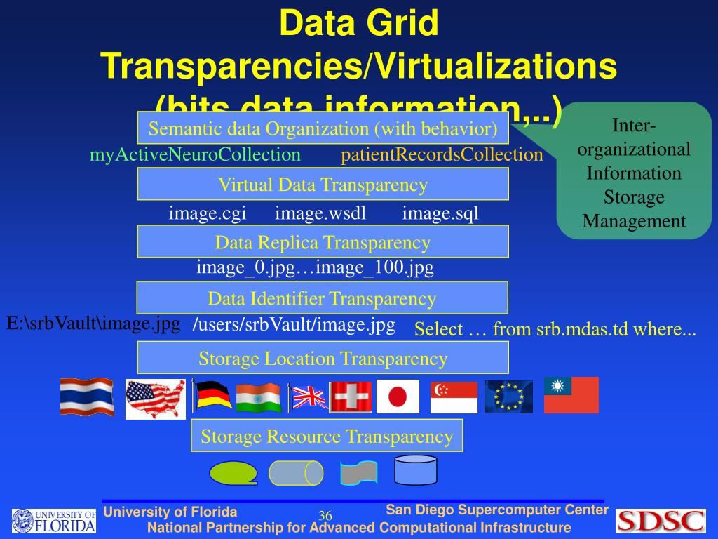 myActiveNeuroCollection patientRecordsCollection image.cgi image.wsdl image.sql E:\srbVault\image.jpg /users/srbVault/image.jpg Select … from srb.mdas.td where... Data Grid Transparencies/Virtualizations (bits,data,information,..) Inter-organizational Information Storage Management Semantic data Organization (with behavior) Virtual Data Transparency Data Replica Transparency image_0.jpg…image_100.jpg Data Identifier Transparency Storage Location Transparency Storage Resource Transparency