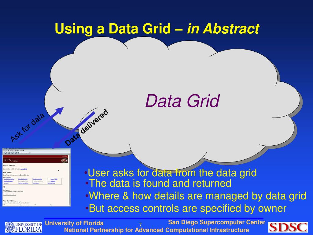 Data delivered Ask for data • The data is found and returned • Where & how details are managed by data grid • But access controls are specified by owner Using a Data Grid – in Abstract Data Grid • User asks for data from the data grid
