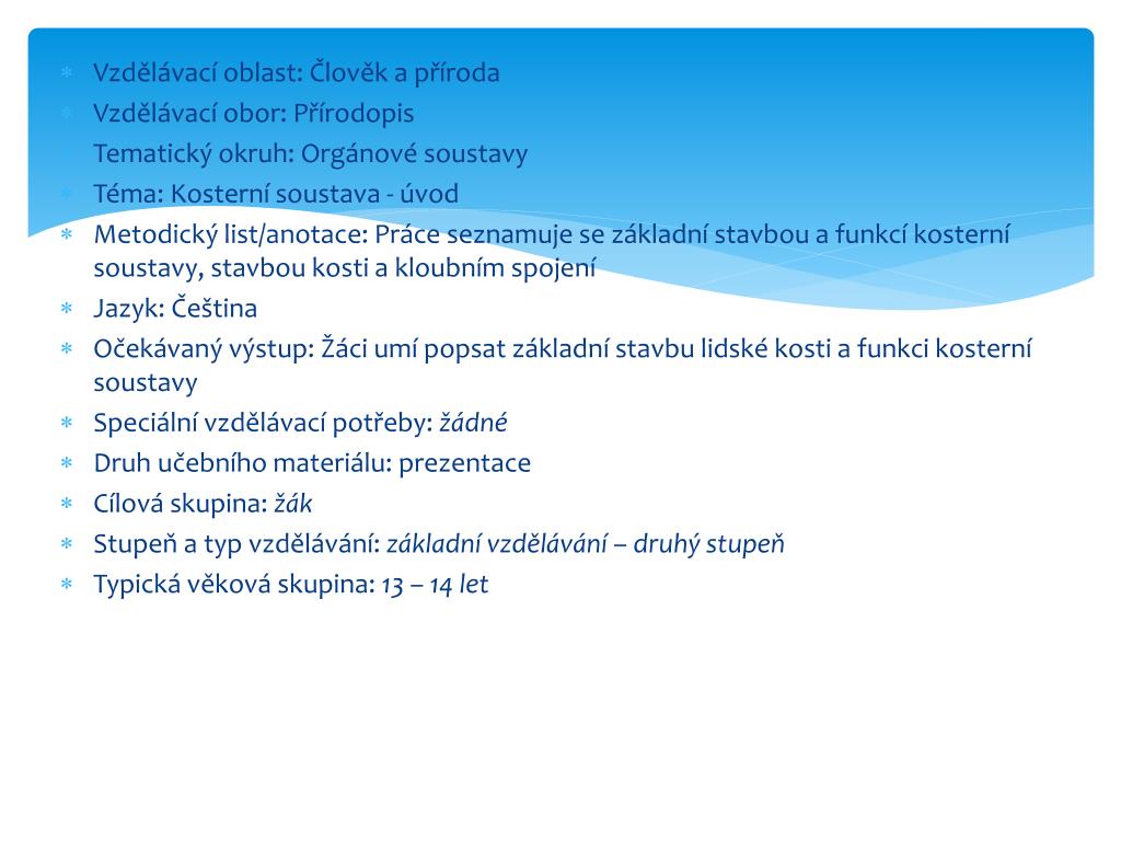 Vzdělávací oblast: Člověk a příroda Vzdělávací obor: Přírodopis Tematický okruh: Orgánové soustavy Téma: Kosterní soustava - úvod Metodický list/anotace: Práce seznamuje se základní stavbou a funkcí kosterní soustavy, stavbou kosti a kloubním spojení Jazyk: Čeština Očekávaný výstup: Žáci umí popsat základní stavbu lidské kosti a funkci kosterní soustavy Speciální vzdělávací potřeby: žádné Druh učebního materiálu: prezentace Cílová skupina: žák Stupeň a typ vzdělávání: základní vzdělávání – druhý stupeň Typická věková skupina: 13 – 14 let