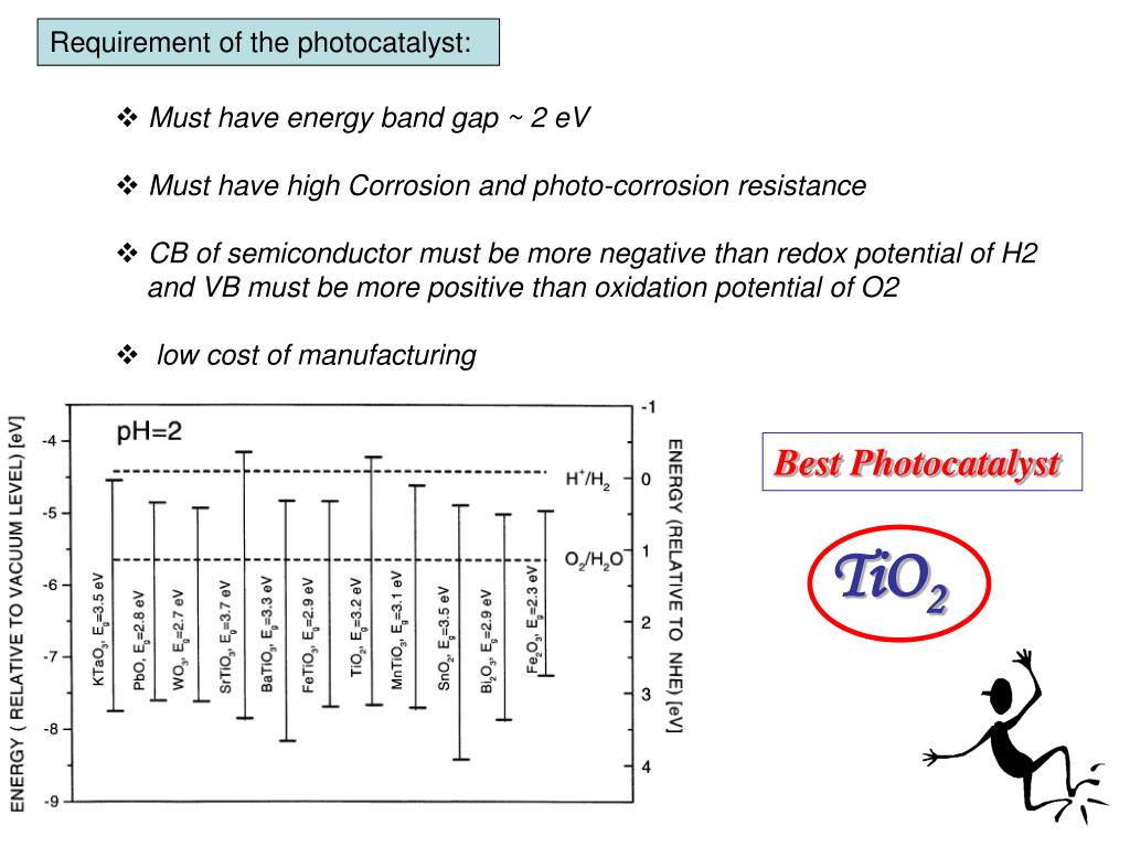 Requirement of the photocatalyst: • Must have energy band gap ~ 2 eV • Must have high Corrosion and photo-corrosion resistance • CB of semiconductor must be more negative than redox potential of H2 and VB must be more positive than oxidation potential of O2 • low cost of manufacturing Best Photocatalyst TiO2