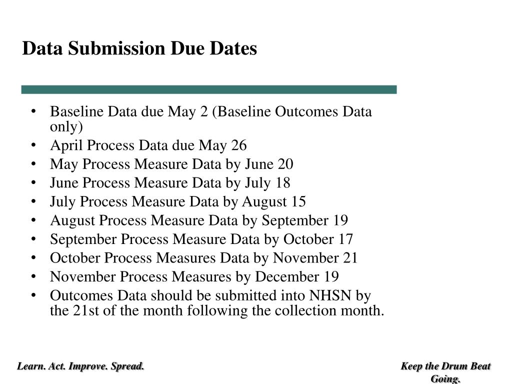 Data Submission Due Dates Baseline Data due May 2 (Baseline Outcomes Data only) April Process Data due May 26 May Process Measure Data by June 20 June Process Measure Data by July 18 July Process Measure Data by August 15 August Process Measure Data by September 19 September Process Measure Data by October 17 October Process Measures Data by November 21 November Process Measures by December 19 Outcomes Data should be submitted into NHSN by the 21st of the month following the collection month.