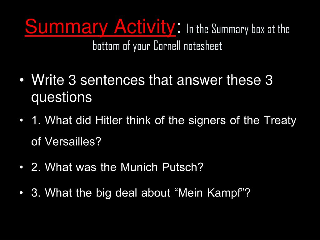 Summary Activity: In the Summary box at the bottom of your Cornell notesheet • Write 3 sentences that answer these 3 questions • 1. What did Hitler think of the signers of the Treaty of Versailles? • 2. What was the Munich Putsch? • 3. What the big deal about “Mein Kampf”?