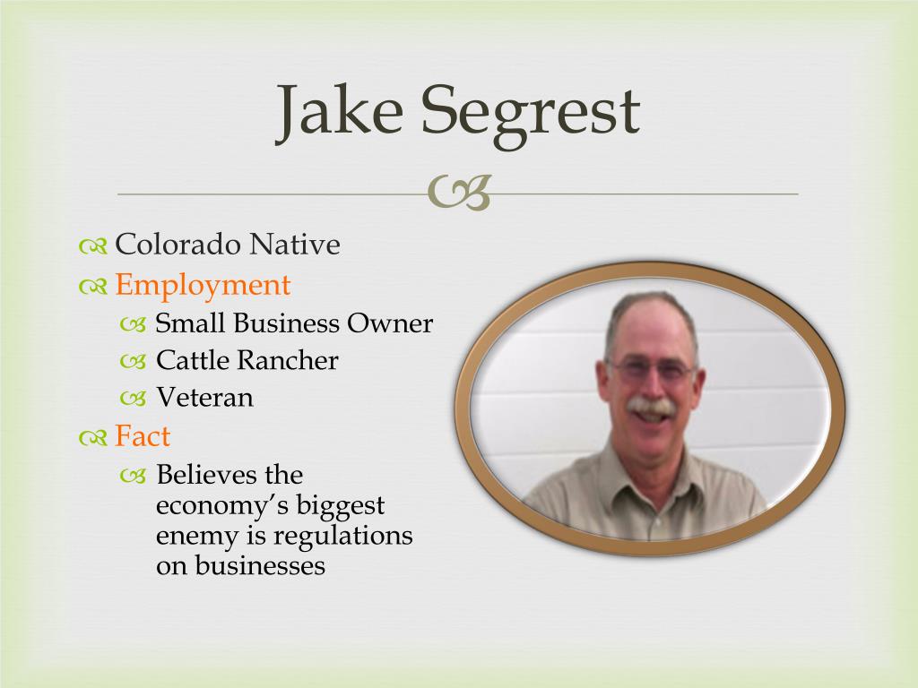 Jake Segrest • Colorado Native • Employment • Small Business Owner • Cattle Rancher • Veteran • Fact • Believes the economy’s biggest enemy is regulations on businesses