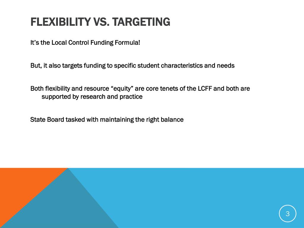 Flexibility vs. Targeting • It’s the Local Control Funding Formula! • But, it also targets funding to specific student characteristics and needs • Both flexibility and resource “equity” are core tenets of the LCFF and both are supported by research and practice • State Board tasked with maintaining the right balance