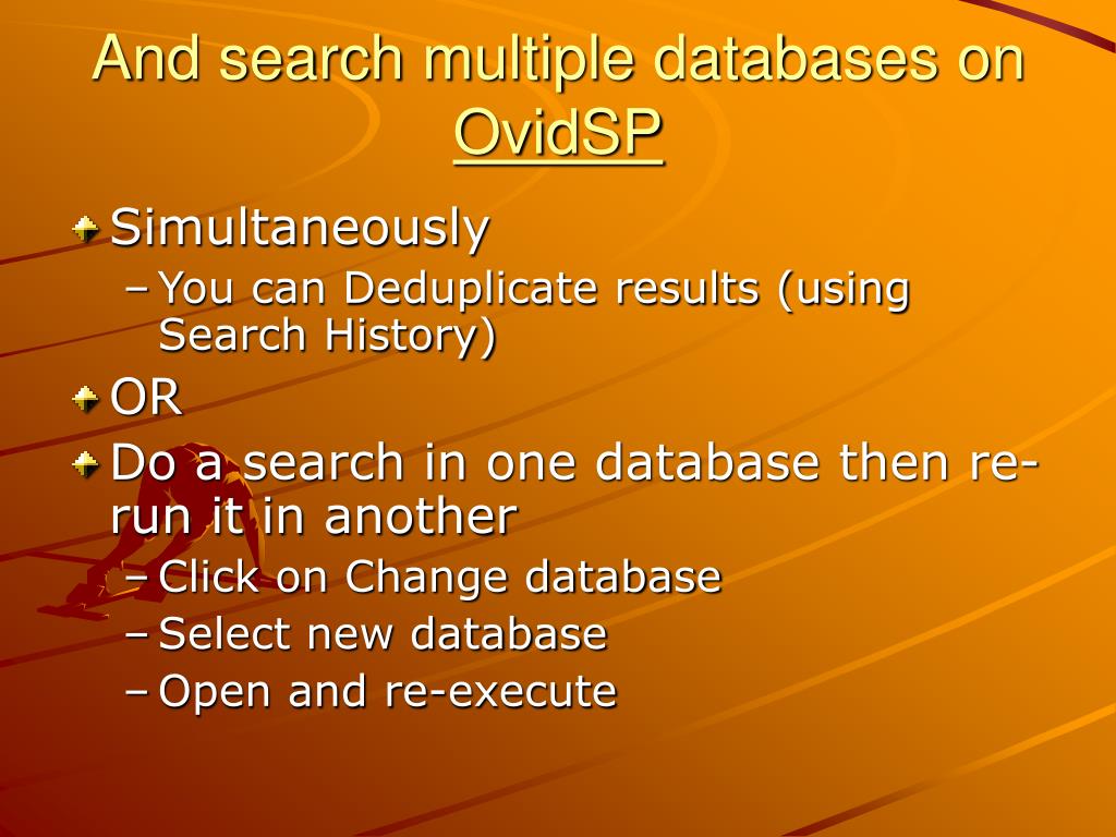 And search multiple databases on OvidSP • Simultaneously • You can Deduplicate results (using Search History) • OR • Do a search in one database then re-run it in another • Click on Change database • Select new database • Open and re-execute
