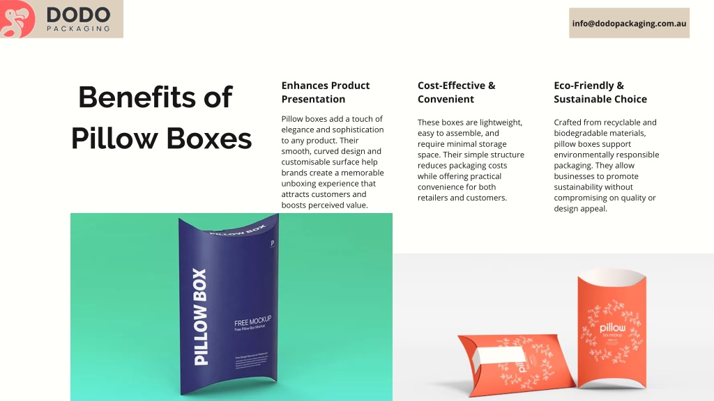 Applications Across Industries Retail & Commercial Use Events & Promotional Packaging These boxes are also popular for events, weddings, and corporate promotions. They can be customized with themes, colors, or logos, making them perfect for giveaways, favors, and personalized gifts. Their sleek design adds a premium touch to any occasion, leaving a lasting impression on recipients. Pillow boxes are widely used in retail for packaging products such as cosmetics, jewelry, accessories, and small gifts. Their elegant appearance enhances brand image and helps attract customers in stores or online. Businesses appreciate their versatility and easy customisation to suit different product types and branding styles. info@dodopackaging.com.au
