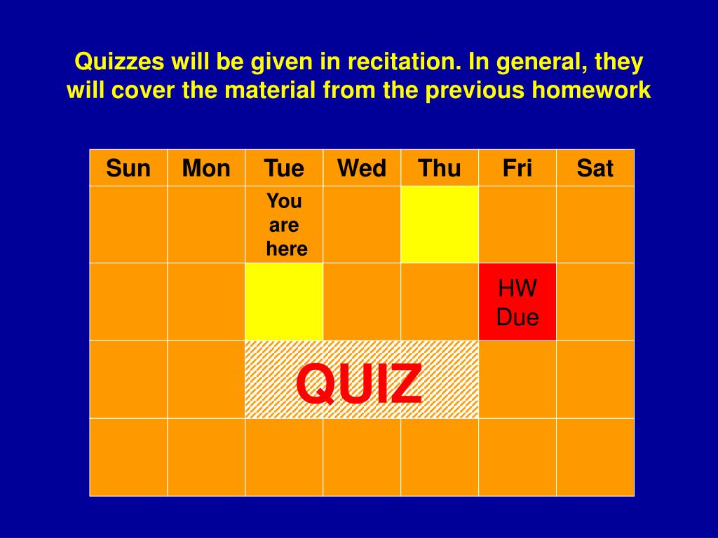 Quizzes will be given in recitation. In general, they will cover the material from the previous homework Sun Mon Tue Wed Thu Fri Sat You are here HW Due QUIZ
