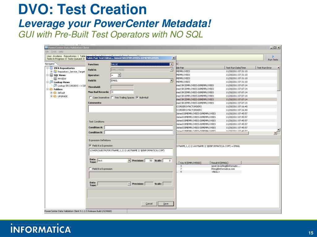 DVO: Test CreationLeverage your PowerCenter Metadata!GUI with Pre-Built Test Operators with NO SQL