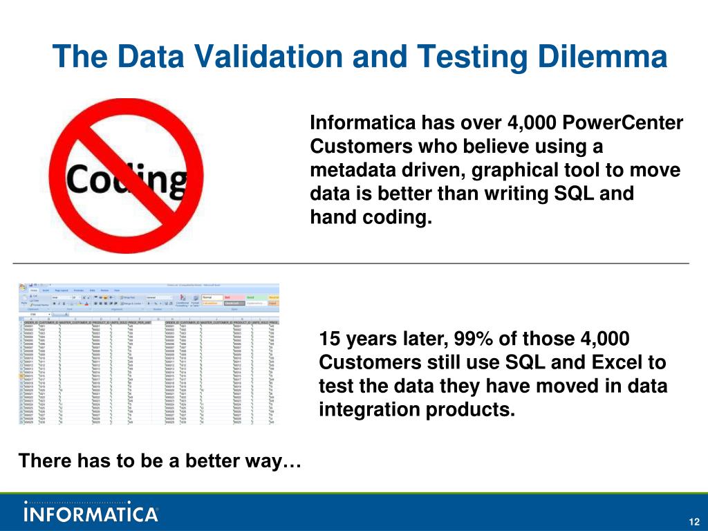 The Data Validation and Testing Dilemma Informatica has over 4,000 PowerCenter Customers who believe using a metadata driven, graphical tool to move data is better than writing SQL and hand coding. 15 years later, 99% of those 4,000 Customers still use SQL and Excel to test the data they have moved in data integration products. There has to be a better way…