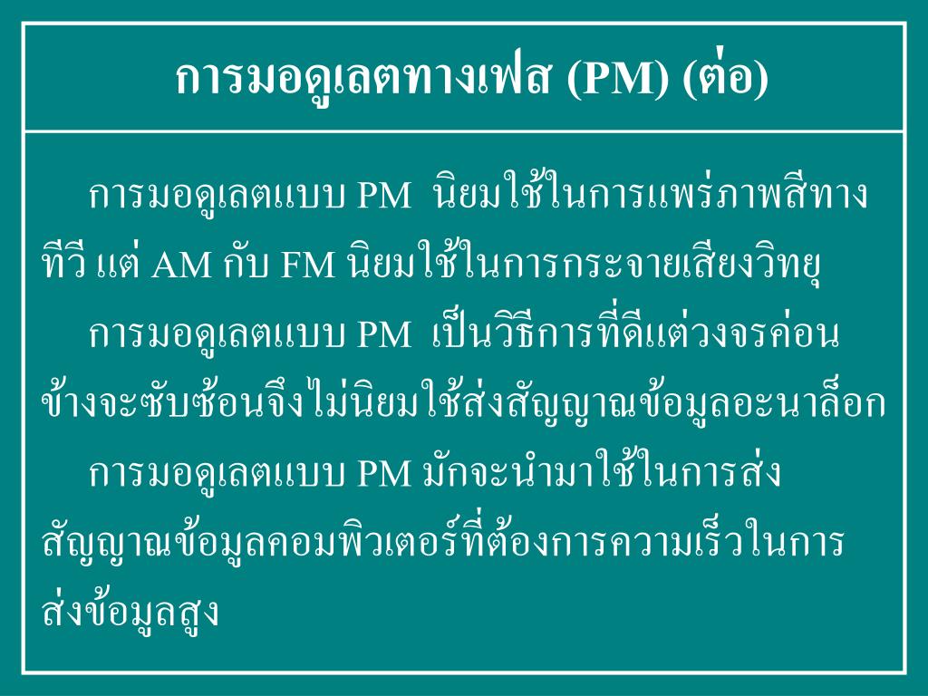 การมอดูเลตทางเฟส (PM) (ต่อ) การมอดูเลตแบบ PM นิยมใช้ในการแพร่ภาพสีทาง ทีวี แต่ AM กับ FM นิยมใช้ในการกระจายเสียงวิทยุ การมอดูเลตแบบ PM เป็นวิธีการที่ดีแต่วงจรค่อน ข้างจะซับซ้อนจึงไม่นิยมใช้ส่งสัญญาณข้อมูลอะนาล็อก การมอดูเลตแบบ PM มักจะนำมาใช้ในการส่ง สัญญาณข้อมูลคอมพิวเตอร์ที่ต้องการความเร็วในการ ส่งข้อมูลสูง