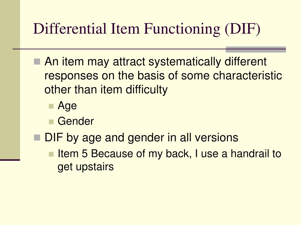 Differential Item Functioning (DIF) • An item may attract systematically different responses on the basis of some characteristic other than item difficulty • Age • Gender • DIF by age and gender in all versions • Item 5 Because of my back, I use a handrail to get upstairs