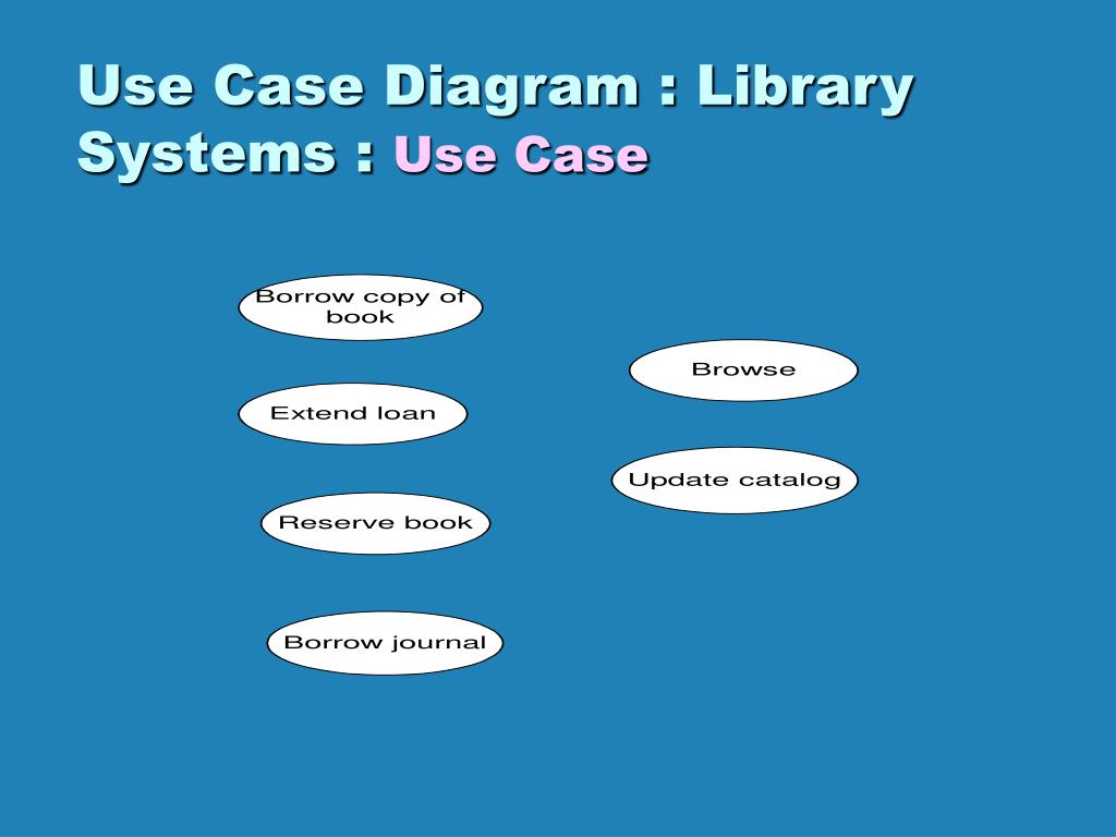 Use Case Diagram : Library System Books and journalsThe library contains books and journals. It may have several copies of a given book. Some of the books are for short term loans only. All other books may be borrowed by any library member for three weeks. Members of the library can normally borrow up to six items at a time, but members of staff may borrow up to 12 items at one time. Only members of staff may borrow journals. Borrowing The system must keep track of when books and journals are borrowed and returned, enforcing the rules described above. Browsing The system should allow users to search for a book on a particular topic, by a particular author etc., to check whether a copy of book is available for loan and, if not, to reserve the book. Anybody can browse in the library.