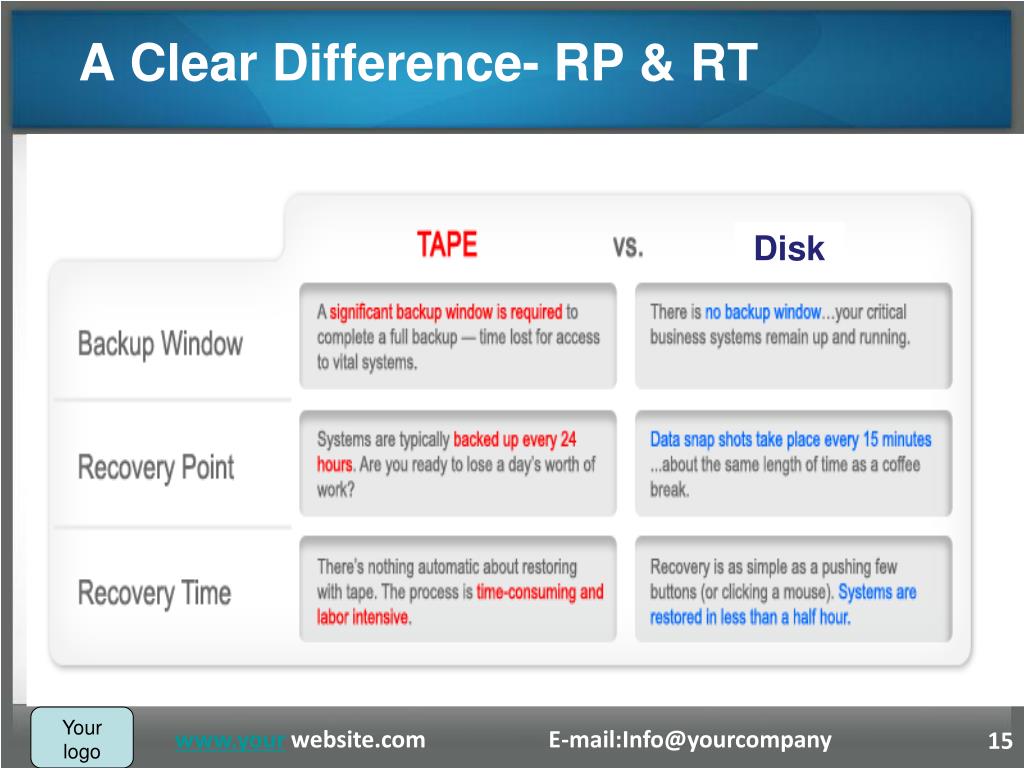 Steps to Restoration with a Tape Backup Will Recovery Time Objective be met? • With tape, the estimated recovery time from a server crash is 16-40 hours leading to costly business downtime. How much does one hour of downtime cost you? • Repair downed server, purchase or acquire a new server • If new server, install same OS and all applications • Find tape backup that is exactly the same that will work with the new server hardware • Install the exact same tape back up software • Restore the data using the exact tape chain required if incrementals are being done. Any break in the chain could result in a failure and either data or emails may be lost.