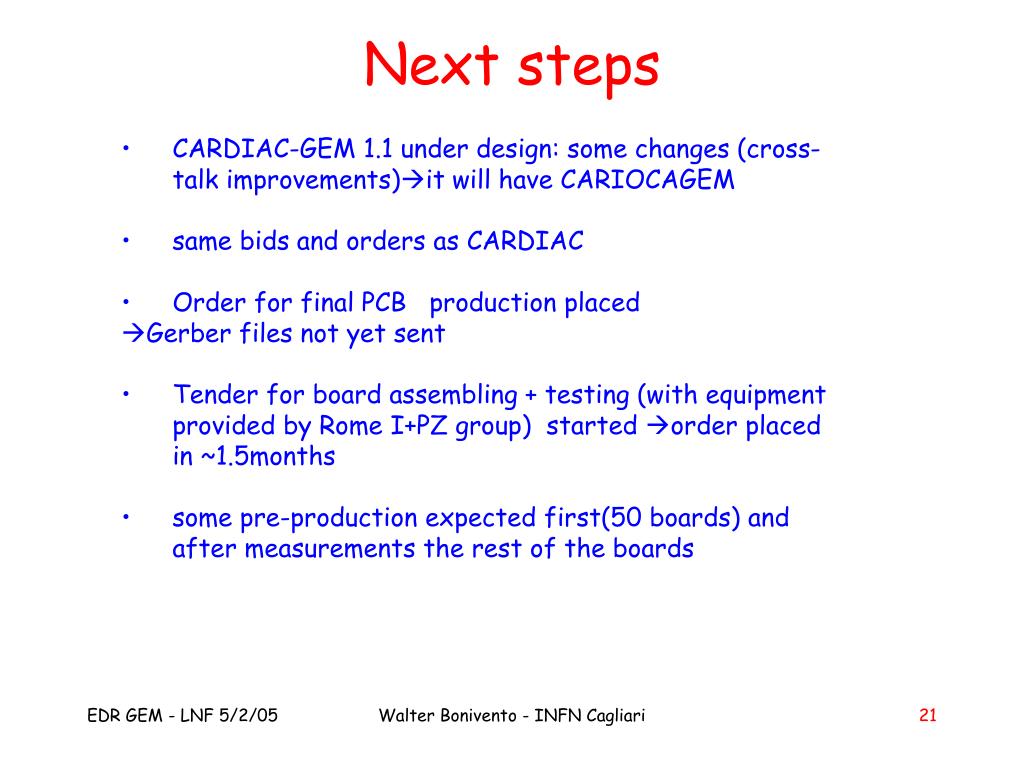 Next steps • CARDIAC-GEM 1.1 under design: some changes (cross-talk improvements)it will have CARIOCAGEM • same bids and orders as CARDIAC • Order for final PCB production placed • Gerber files not yet sent • Tender for board assembling + testing (with equipment provided by Rome I+PZ group) started order placed in ~1.5months • some pre-production expected first(50 boards) and after measurements the rest of the boards Walter Bonivento - INFN Cagliari