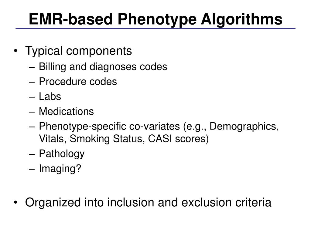 EMR-based Phenotype Algorithms • Typical components • Billing and diagnoses codes • Procedure codes • Labs • Medications • Phenotype-specific co-variates (e.g., Demographics, Vitals, Smoking Status, CASI scores) • Pathology • Imaging? • Organized into inclusion and exclusion criteria
