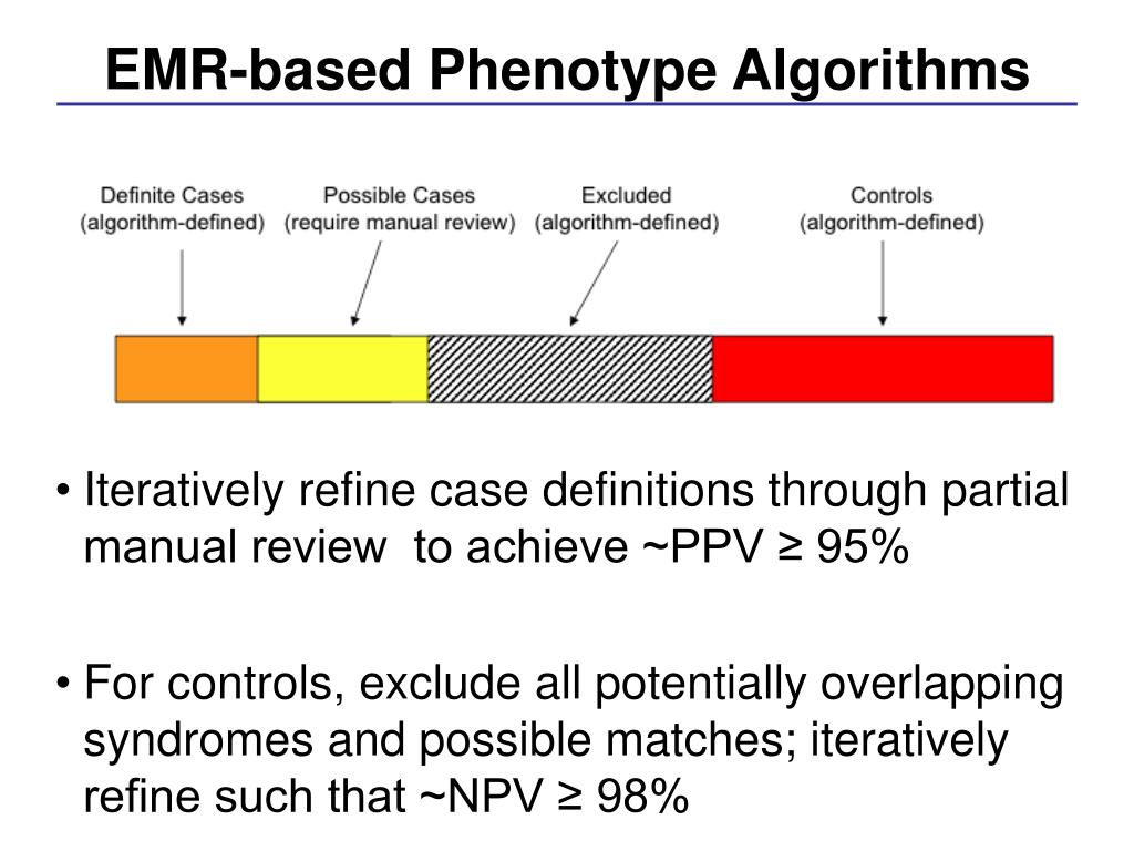 EMR-based Phenotype Algorithms Iteratively refine case definitions through partial manual review to achieve ~PPV ≥ 95% For controls, exclude all potentially overlapping syndromes and possible matches; iteratively refine such that ~NPV ≥ 98%