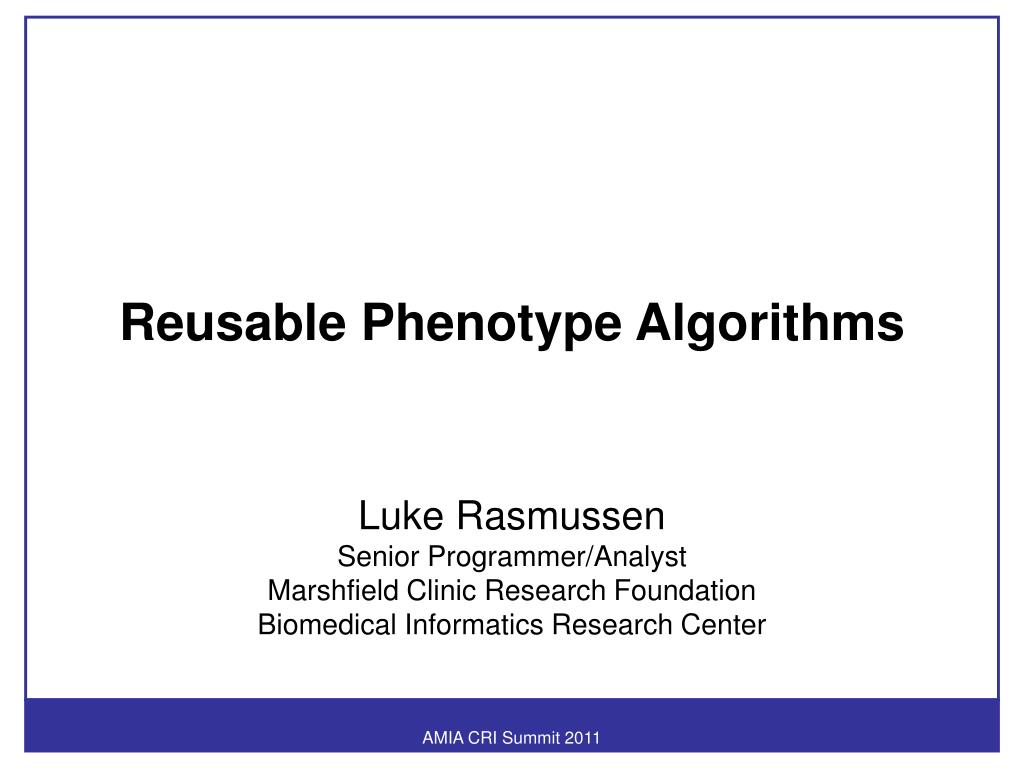 Reusable Phenotype Algorithms Luke Rasmussen Senior Programmer/Analyst Marshfield Clinic Research Foundation Biomedical Informatics Research Center AMIA CRI Summit 2011