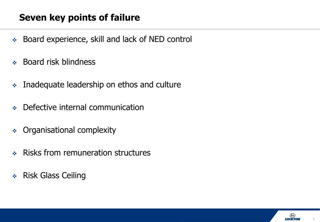 Seven key points of failure • Board experience, skill and lack of NED control • Board risk blindness • Inadequate leadership on ethos and culture • Defective internal communication • Organisational complexity • Risks from remuneration structures • Risk Glass Ceiling