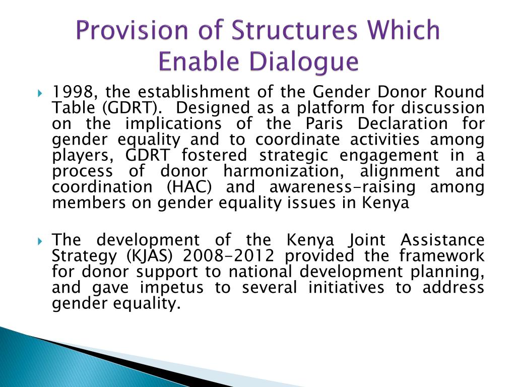 Provision of Structures Which Enable Dialogue • 1998, the establishment of the Gender Donor Round Table (GDRT). Designed as a platform for discussion on the implications of the Paris Declaration for gender equality and to coordinate activities among players, GDRT fostered strategic engagement in a process of donor harmonization, alignment and coordination (HAC) and awareness-raising among members on gender equality issues in Kenya • The development of the Kenya Joint Assistance Strategy (KJAS) 2008-2012 provided the framework for donor support to national development planning, and gave impetus to several initiatives to address gender equality.