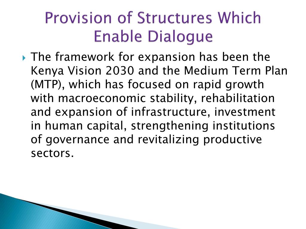 Provision of Structures Which Enable Dialogue • The framework for expansion has been the Kenya Vision 2030 and the Medium Term Plan (MTP), which has focused on rapid growth with macroeconomic stability, rehabilitation and expansion of infrastructure, investment in human capital, strengthening institutions of governance and revitalizing productive sectors.