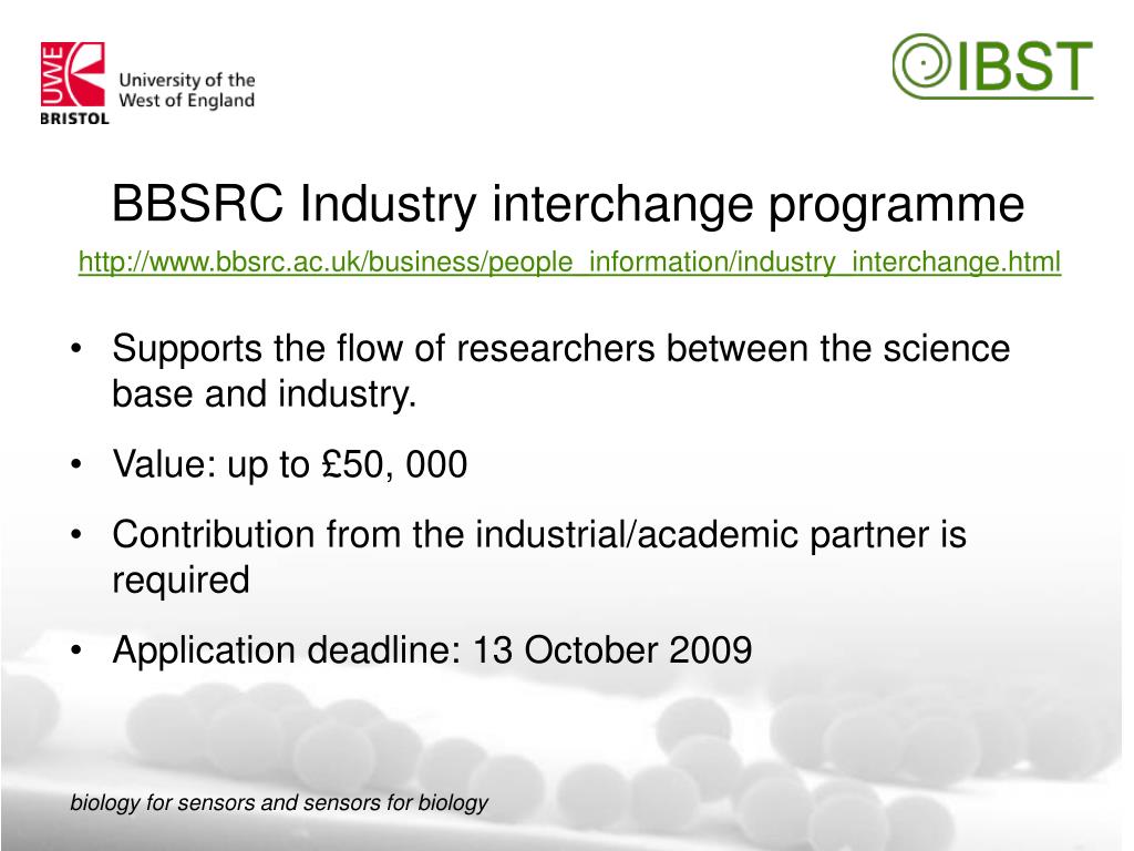 BBSRC Industry interchange programme http://www.bbsrc.ac.uk/business/people_information/industry_interchange.html • Supports the flow of researchers between the science base and industry. • Value: up to £50, 000 • Contribution from the industrial/academic partner is required • Application deadline: 13 October 2009 biology for sensors and sensors for biology