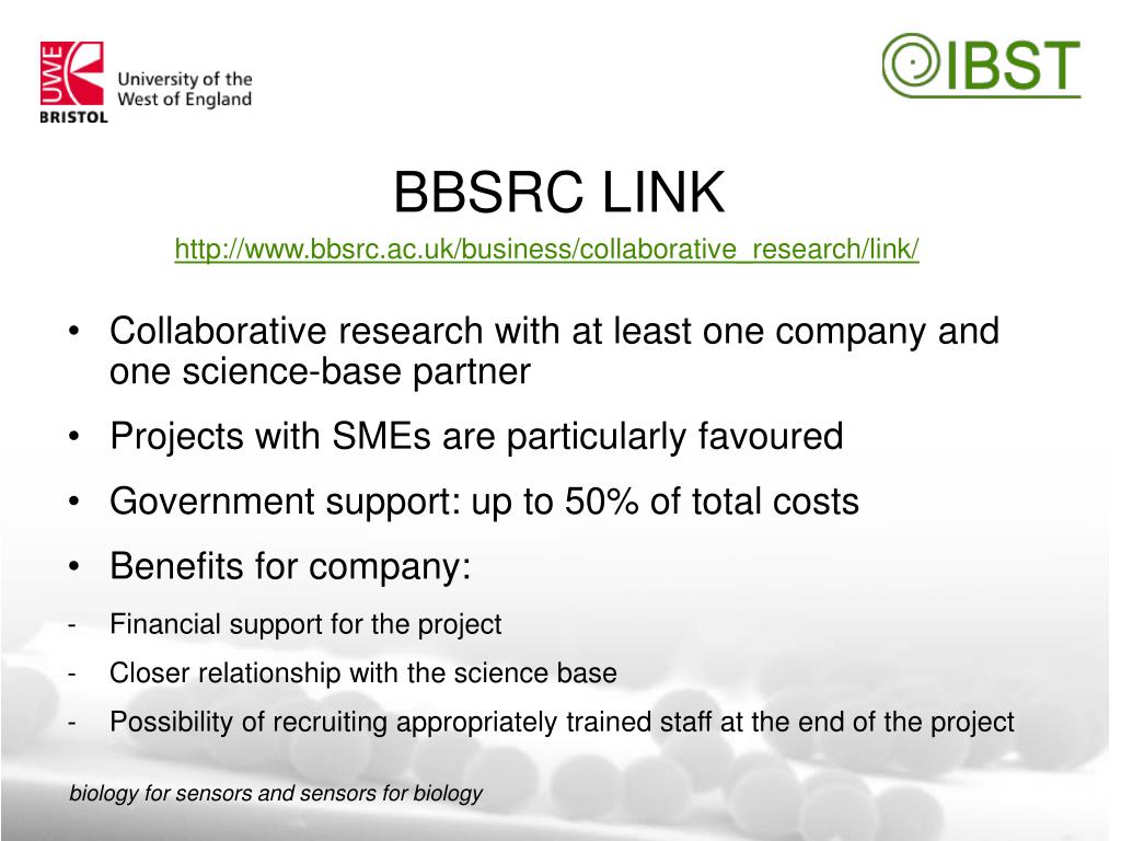 BBSRC LINK http://www.bbsrc.ac.uk/business/collaborative_research/link/ • Collaborative research with at least one company and one science-base partner • Projects with SMEs are particularly favoured • Government support: up to 50% of total costs • Benefits for company: • Financial support for the project • Closer relationship with the science base • Possibility of recruiting appropriately trained staff at the end of the project biology for sensors and sensors for biology