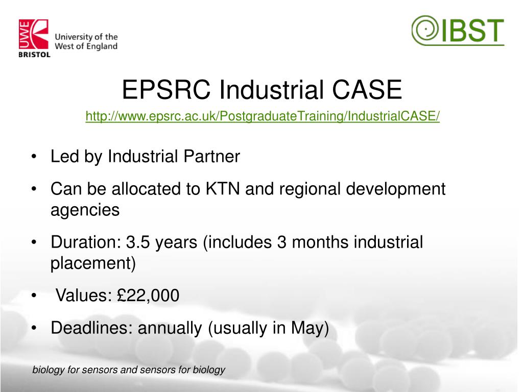 EPSRC Industrial CASE http://www.epsrc.ac.uk/PostgraduateTraining/IndustrialCASE/ • Led by Industrial Partner • Can be allocated to KTN and regional development agencies • Duration: 3.5 years (includes 3 months industrial placement) • Values: £22,000 • Deadlines: annually (usually in May) biology for sensors and sensors for biology