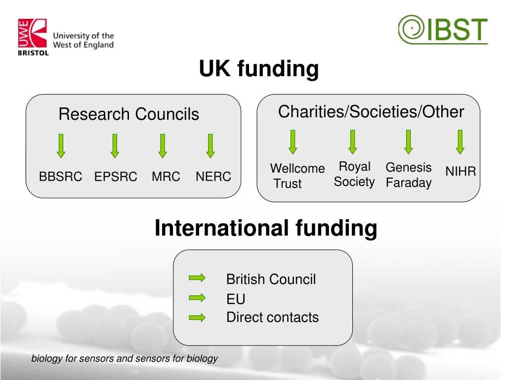 UK funding Charities/Societies/Other Research Councils Royal Society Genesis Faraday Wellcome Trust NIHR BBSRC MRC NERC EPSRC International funding British Council EU Direct contacts biology for sensors and sensors for biology
