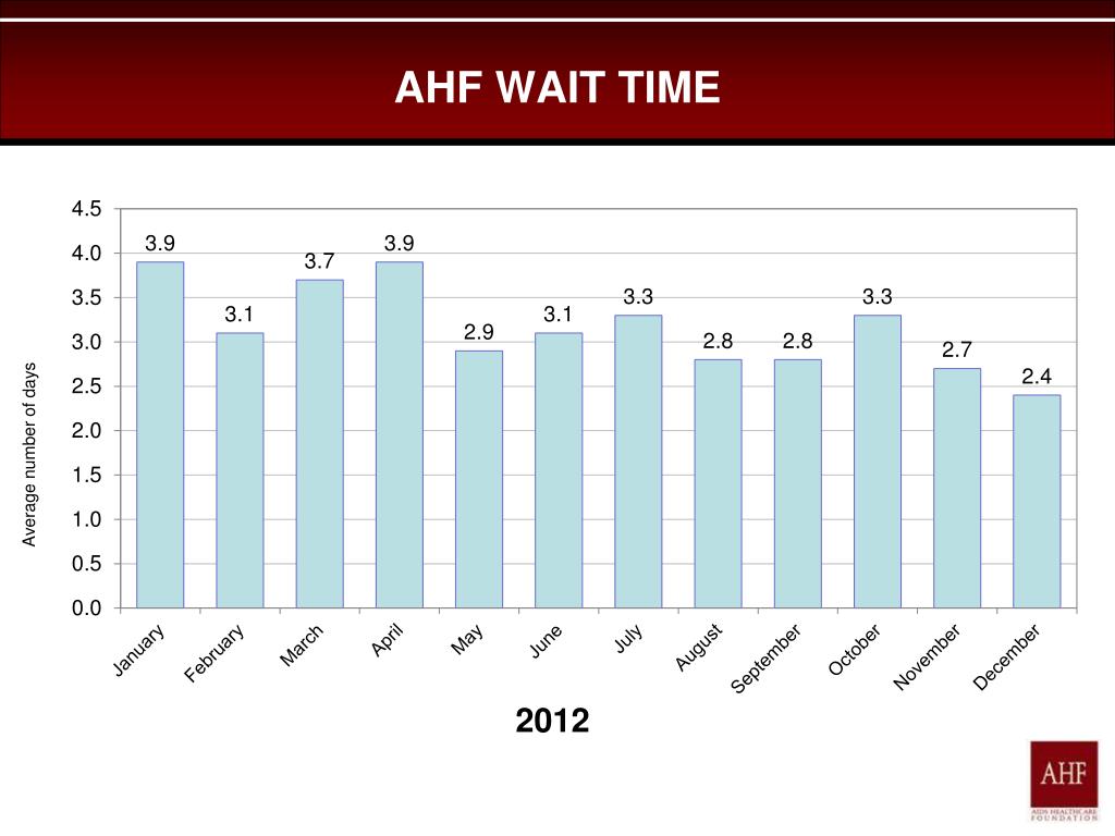 CONCLUSIONOUTPATIENT MEDICAL • Our 2012 No Show rate of 16.4% showed a decrease of 2percentage points from 2010 and 1.7 percentage points from 2011. • Reminder calls with a smiling voice increase the chance of patients continuing their care. • Peer navigators calling no shows to assist them in rescheduling is very productive. • Stressing the importance of a correct address and phone number from the patient is being achieved by the front desk. • AHF will always strive to lower the patient wait time below 72 hours.