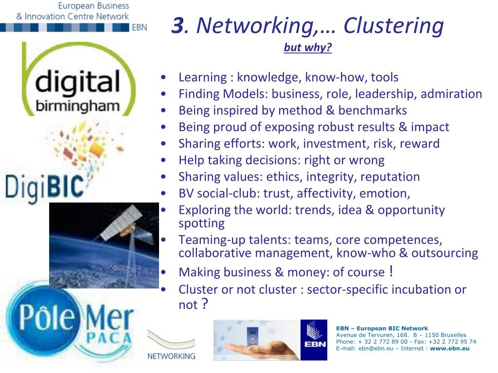 3. Networking,… Clusteringbut why? • Learning : knowledge, know-how, tools • FindingModels: business, role, leadership, admiration • Beinginspired by method & benchmarks • Beingproud of exposingrobustresults & impact • Sharing efforts: work, investment, risk, reward • Help takingdecisions: right or wrong • Sharing values: ethics, integrity, reputation • BV social-club: trust, affectivity, emotion, • Exploring the world: trends, idea & opportunityspotting • Teaming-up talents: teams, corecompetences, collaborative management, know-who & outsourcing • Making business & money: of course ! • Cluster or not cluster : sector-specific incubation or not ?