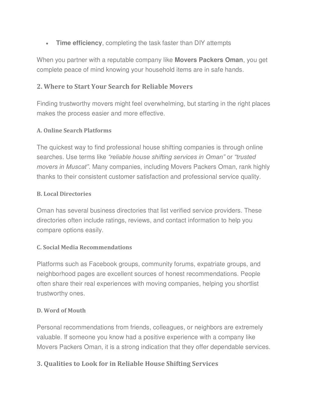 Time efficiency, completing the task faster than DIY attempts When you partner with a reputable company like Movers Packers Oman, you get complete peace of mind knowing your household items are in safe hands. 2. Where to Start Your Search for Reliable Movers Finding trustworthy movers might feel overwhelming, but starting in the right places makes the process easier and more effective. A. Online Search Platforms The quickest way to find professional house shifting companies is through online searches. Use terms like “reliable house shifting services inOman” or “trusted movers in Muscat”. Many companies, including Movers Packers Oman, rank highly thanks to their consistent customer satisfaction and professional service quality. B. Local Directories Oman has several business directories that list verified service providers. These directories often include ratings, reviews, and contact information to help you compare options easily. C. Social Media Recommendations Platforms such as Facebook groups, community forums, expatriate groups, and neighborhood pages are excellent sources of honest recommendations. People often share their real experiences with moving companies, helping you shortlist trustworthy ones. D. Word of Mouth Personal recommendations from friends, colleagues, or neighbors are extremely valuable. If someone you know had a positive experience with a company like Movers Packers Oman, it is a strong indication that they offer dependable services. 3. Qualities to Look for in Reliable House Shifting Services