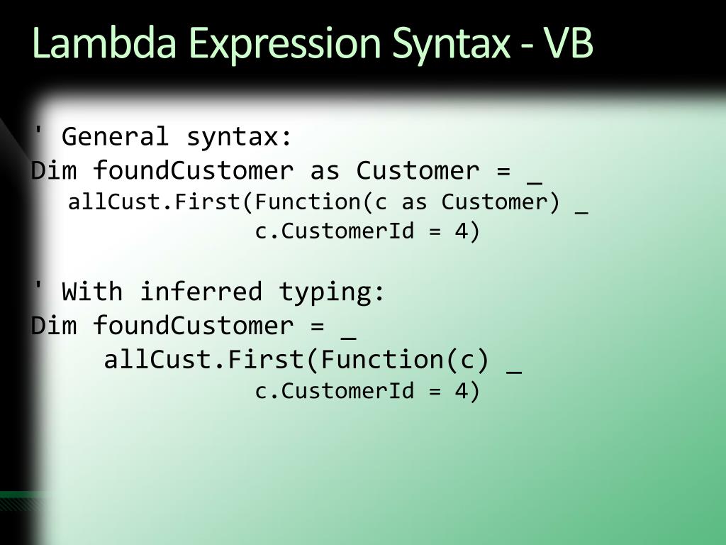 Lambda Expression Syntax - VB ' General syntax: Dim foundCustomer as Customer = _ allCust.First(Function(c as Customer) _ c.CustomerId = 4) ' With inferred typing: Dim foundCustomer = _ allCust.First(Function(c) _ c.CustomerId = 4)