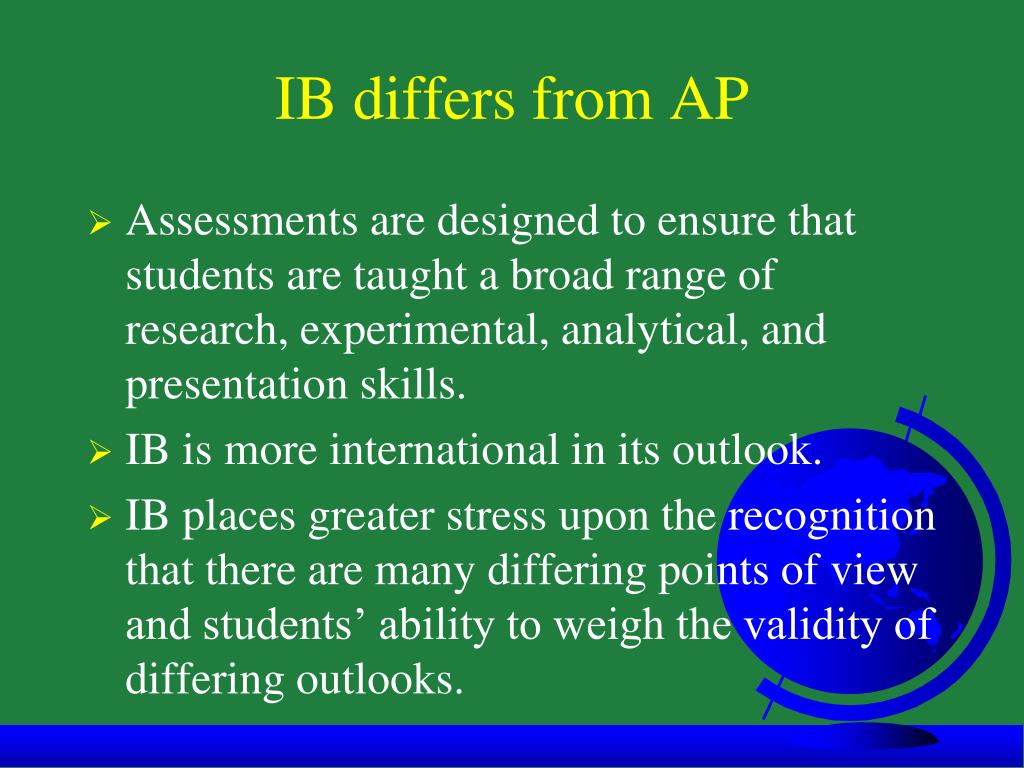 IB differs from AP • Assessments are designed to ensure that students are taught a broad range of research, experimental, analytical, and presentation skills. • IB is more international in its outlook. • IB places greater stress upon the recognition that there are many differing points of view and students’ ability to weigh the validity of differing outlooks.