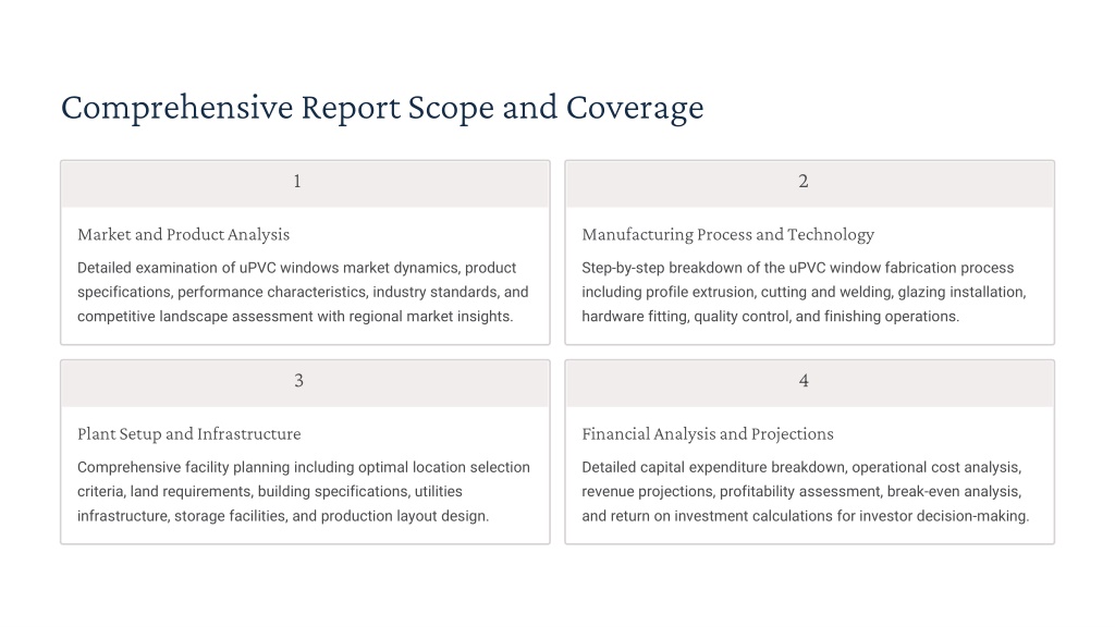 4. Comprehensive Report Scope and Coverage 1 2 Market and Product Analysis Manufacturing Process and Technology Detailed examination of uPVC windows market dynamics, product specifications, performance characteristics, industry standards, and competitive landscape assessment with regional market insights. Step-by-step breakdown of the uPVC window fabrication process including profile extrusion, cutting and welding, glazing installation, hardware fitting, quality control, and finishing operations. 3 4 Plant Setup and Infrastructure Financial Analysis and Projections Comprehensive facility planning including optimal location selection criteria, land requirements, building specifications, utilities infrastructure, storage facilities, and production layout design. Detailed capital expenditure breakdown, operational cost analysis, revenue projections, profitability assessment, break-even analysis, and return on investment calculations for investor decision-making.