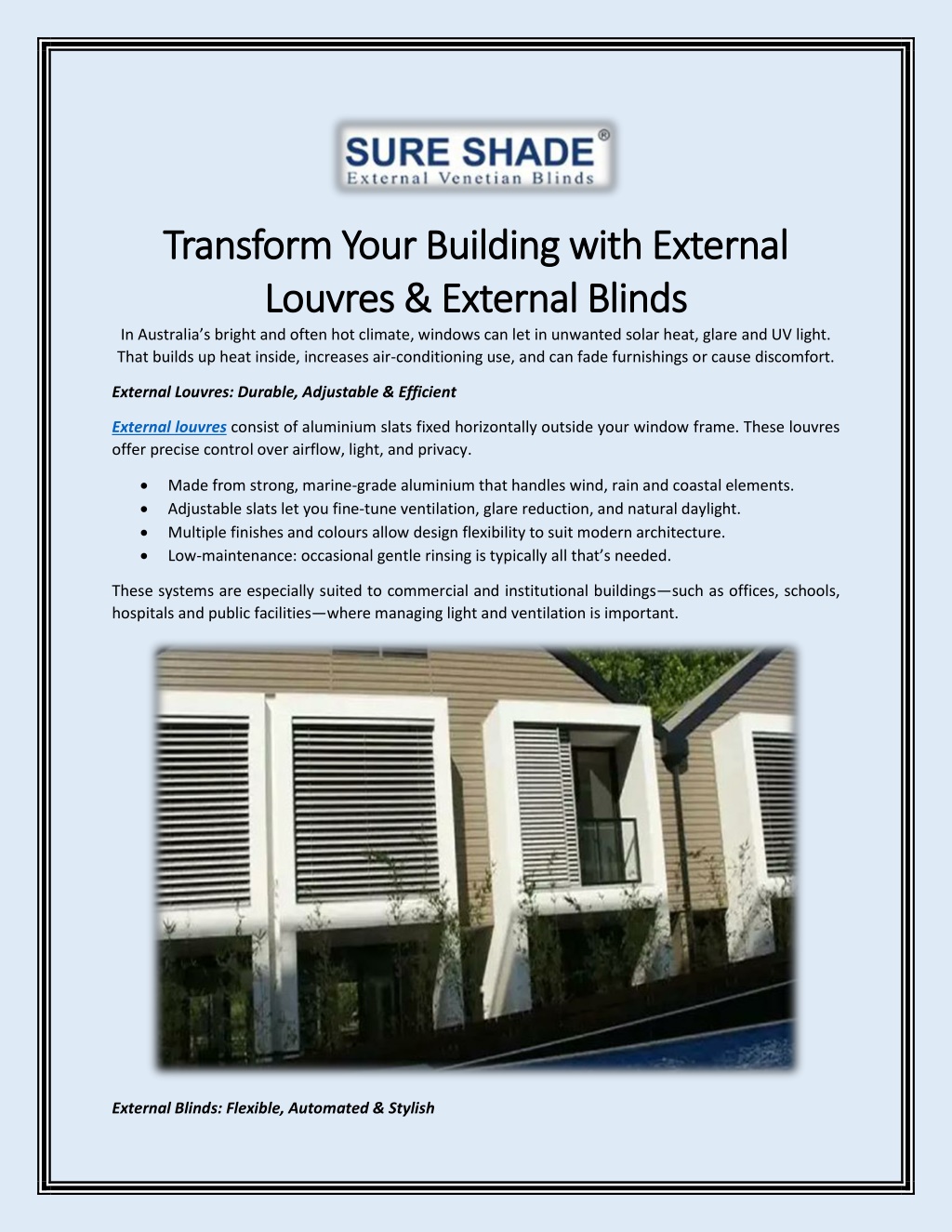 Transform Your Building with External Transform Your Building with External Louvres & External Blinds Louvres & External Blinds In Australia’s bright and often hot climate, windows can let in unwanted solar heat, glare and UV light. That builds up heat inside, increases air-conditioning use, and can fade furnishings or cause discomfort. External Louvres: Durable, Adjustable & Efficient External louvres consist of aluminium slats fixed horizontally outside your window frame. These louvres offer precise control over airflow, light, and privacy. •Made from strong, marine-grade aluminium that handles wind, rain and coastal elements. •Adjustable slats let you fine-tune ventilation, glare reduction, and natural daylight. •Multiple finishes and colours allow design flexibility to suit modern architecture. •Low-maintenance: occasional gentle rinsing is typically all that’s needed. These systems are especially suited to commercial and institutional buildings—such as offices, schools, hospitals and public facilities—where managing light and ventilation is important. External Blinds: Flexible, Automated & Stylish