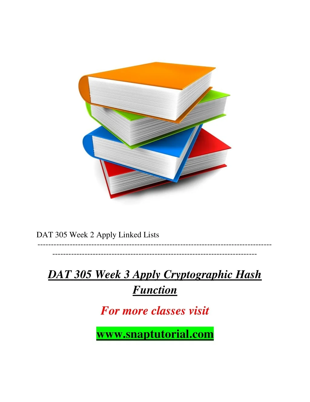 DAT 305 Week 2 Apply Linked Lists --------------------------------------------------------------------------------------- ---------------------------------------------------------------------------- DAT 305 Week 3 Apply Cryptographic Hash Function For more classes visit www.snaptutorial.com