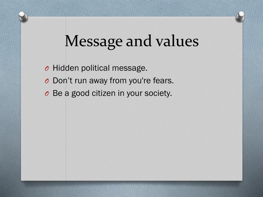 Message and values • Hidden political message. • Don’t run away from you're fears. • Be a good citizen in your society.