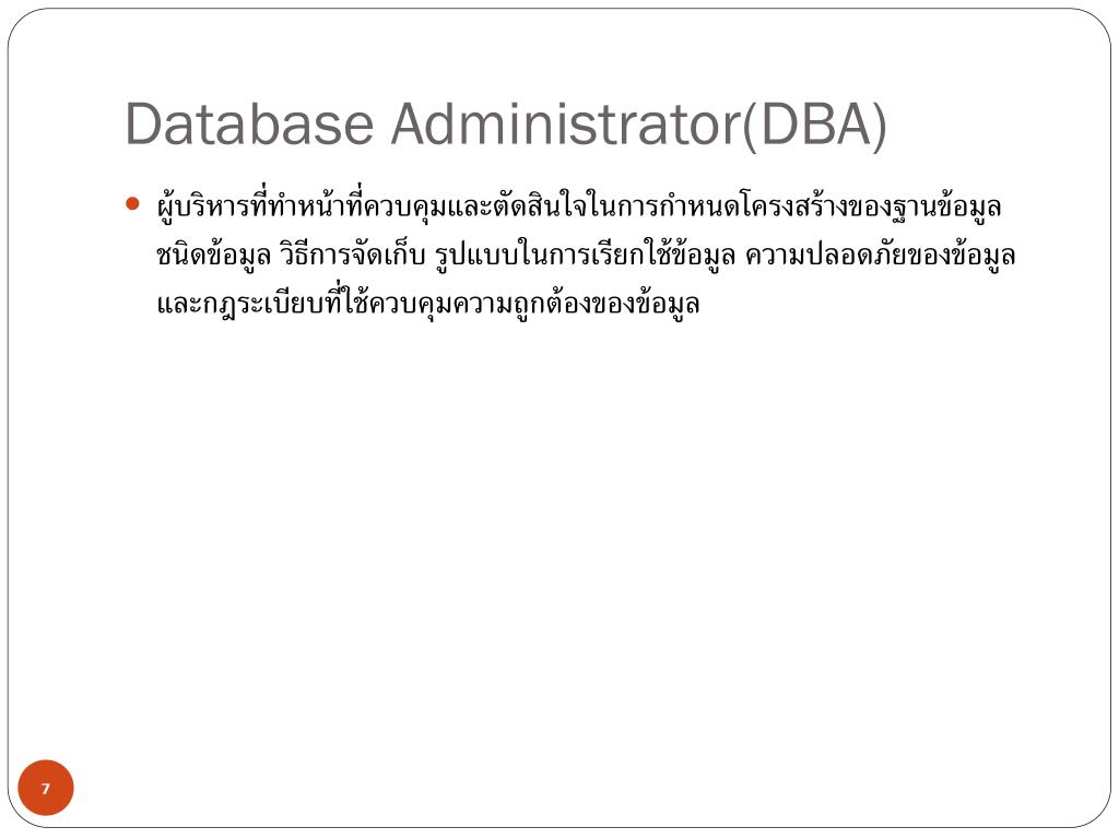 Database Administrator(DBA) • ผู้บริหารที่ทำหน้าที่ควบคุมและตัดสินใจในการกำหนดโครงสร้างของฐานข้อมูล ชนิดข้อมูล วิธีการจัดเก็บ รูปแบบในการเรียกใช้ข้อมูล ความปลอดภัยของข้อมูลและกฎระเบียบที่ใช้ควบคุมความถูกต้องของข้อมูล