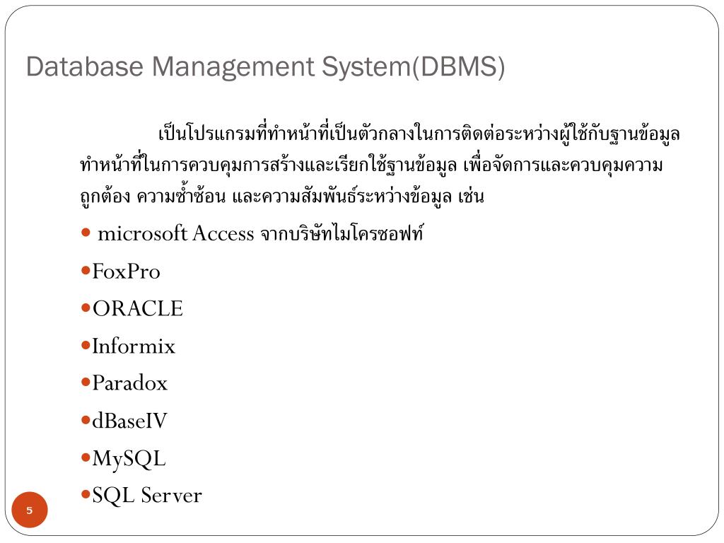 Database Management System(DBMS) เป็นโปรแกรมที่ทำหน้าที่เป็นตัวกลางในการติดต่อระหว่างผู้ใช้กับฐานข้อมูล ทำหน้าที่ในการควบคุมการสร้างและเรียกใช้ฐานข้อมูล เพื่อจัดการและควบคุมความถูกต้อง ความซ้ำซ้อน และความสัมพันธ์ระหว่างข้อมูล เช่น • microsoft Access จากบริษัทไมโครซอฟท์ • FoxPro • ORACLE • Informix • Paradox • dBaseIV • MySQL • SQL Server