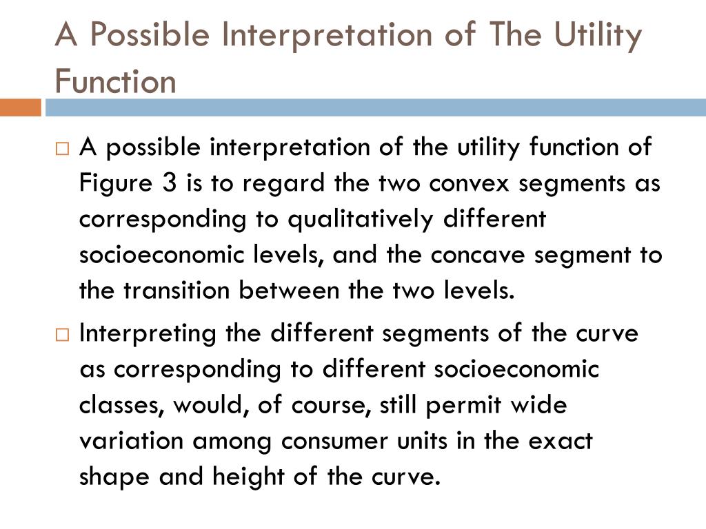 A Possible Interpretation of The Utility Function • A possible interpretation of the utility function of Figure 3 is to regard the two convex segments as corresponding to qualitatively different socioeconomic levels, and the concave segment to the transition between the two levels. • Interpreting the different segments of the curve as corresponding to different socioeconomic classes, would, of course, still permit wide variation among consumer units in the exact shape and height of the curve.