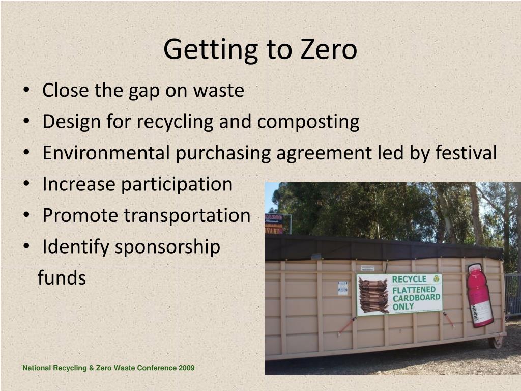 Getting to Zero • Close the gap on waste • Design for recycling and composting • Environmental purchasing agreement led by festival • Increase participation • Promote transportation • Identify sponsorship funds