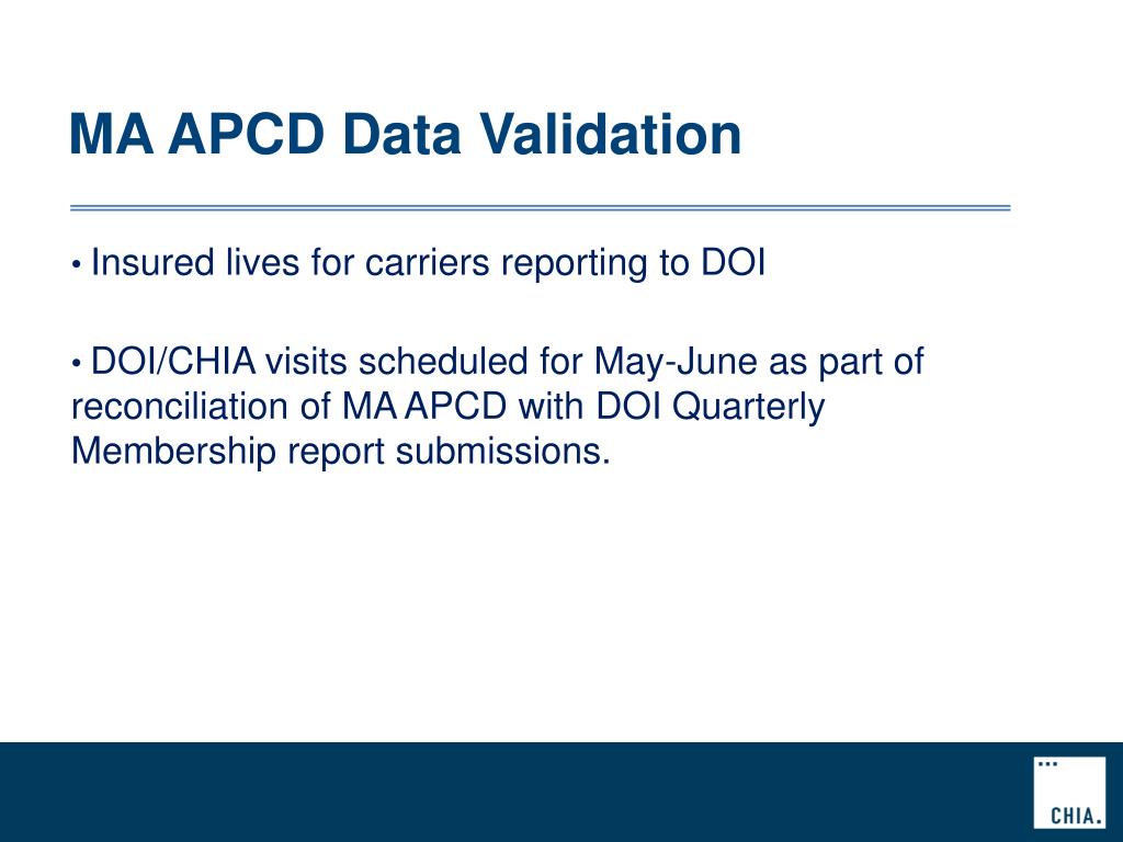 MA APCD Data Validation Insured lives for carriers reporting to DOI DOI/CHIA visits scheduled for May-June as part of reconciliation of MA APCD with DOI Quarterly Membership report submissions.