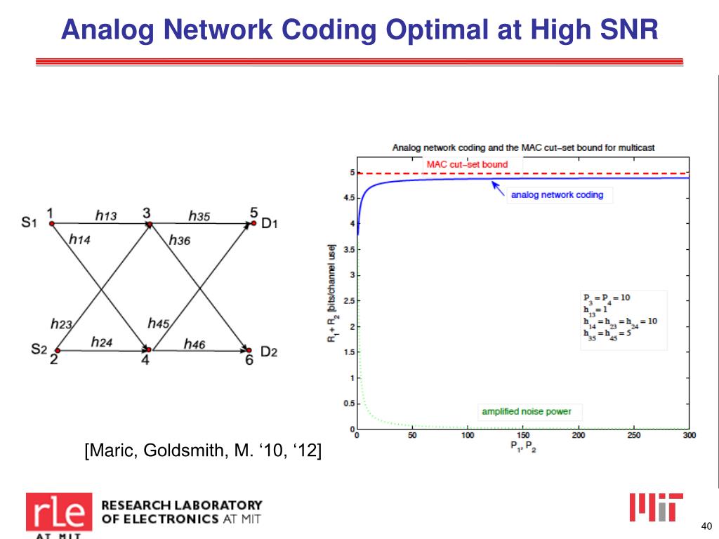 SNR in the Network • High SNR in a link • Small noise • Large gain • Large transmit power • When gains grow with fixed ratio of their logarithms, local high-SNR MAC decomposition holds approximately for multicast connections: • Edges and hyperedges are approximately sufficient • Holds for arbitrary connections, not just multicast • When transmit power grows, amplify and forward at intermediate nodes provides asymptotically multicast capacity – entire network becomes a single MAC, possibly with ISI Avestimehr, Diggavi, Tse, “A deterministic approach to wireless relay networks,” in Allerton 2007 Avestimehr, Diggavi, Tse, “Wireless network information flow,” Allerton 2007 Avestimehr, Diggavi, Tse, “Wireless network information flow: a deterministic approach,” IEEE Trans. Info. Theory, vol. 57, no. 4, April 2011 Kim, M., “Algebraic Network Coding Approach to Deterministic Wireless Relay Network”, Allerton2010 • Maric, Goldsmith, M., “Analog Network Coding in the High SNR Regime”, ITA 2010 • Maric, Goldsmith, M., “Analog Network Coding in the High-SNR Regime”, IEEE Wireless Network Coding Workshop 2010 • Maric, Goldsmith, M., “Multihop Analog Network Coding via Amplify-and-Forward: The High SNR Regime”, IEEE Trans. Info. Theory, vol. 58, no. 2, 2012 • Xu, Yeh, M. “Approaching Gaussian Relay Network Capacity in the High SNR Regime: End-to-End Lattice Codes”, accepted to WCNC 2014.