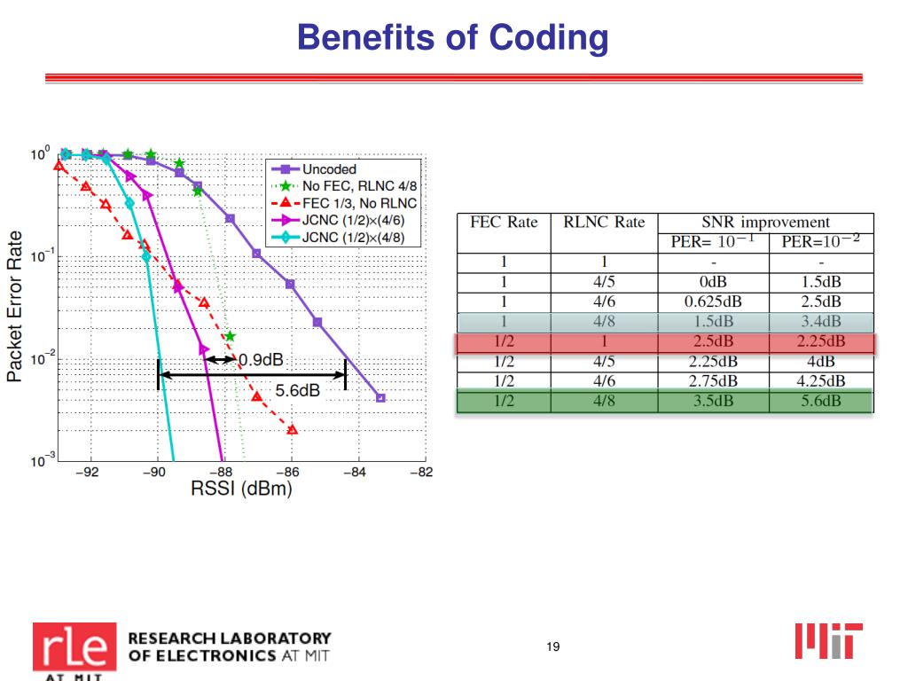 Coding at Different Layers Matlabprogram on a PC through an FPGA. Generic commercial transceiver (Texas Instruments ) Transmission data rate of 500 kbps FSKModulation Data transmission and coherent demodulation at receiver Hard Viterbi decoding and an interleaver of 4 bytes PC-based packet sniffer software transfers the data from the CC2511 over a USB interface CC2511 chip provides the Received Signal Strength Indicator (RSSI) Angelopoulos, Paidimarri, Chandrakasan, M., “Experimental Study of the Interplay of Channel and Network Coding in Low Power Sensor Applications”, ICC 2013