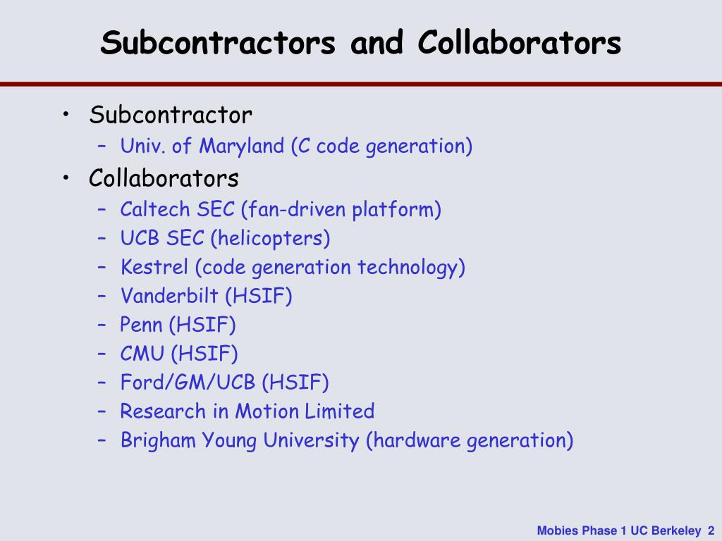 Subcontractors and Collaborators • Subcontractor • Univ. of Maryland (C code generation) • Collaborators • Caltech SEC (fan-driven platform) • UCB SEC (helicopters) • Kestrel (code generation technology) • Vanderbilt (HSIF) • Penn (HSIF) • CMU (HSIF) • Ford/GM/UCB (HSIF) • Research in Motion Limited • Brigham Young University (hardware generation)