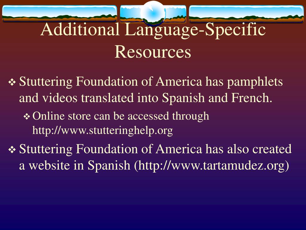 Additional Language-Specific Resources • Stuttering Foundation of America has pamphlets and videos translated into Spanish and French. • Online store can be accessed through http://www.stutteringhelp.org • Stuttering Foundation of America has also created a website in Spanish (http://www.tartamudez.org)