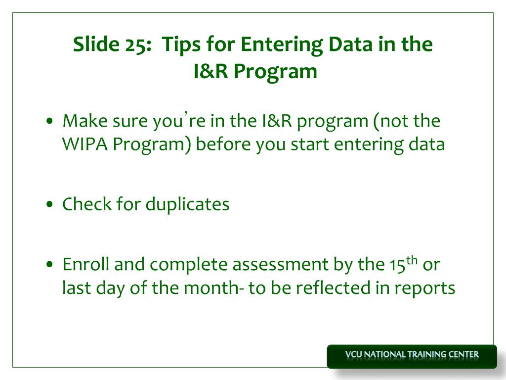 Slide 25: Tips for Entering Data in the I&R Program • Make sure you’re in the I&R program (not the WIPA Program) before you start entering data • Check for duplicates • Enroll and complete assessment by the 15th or last day of the month- to be reflected in reports