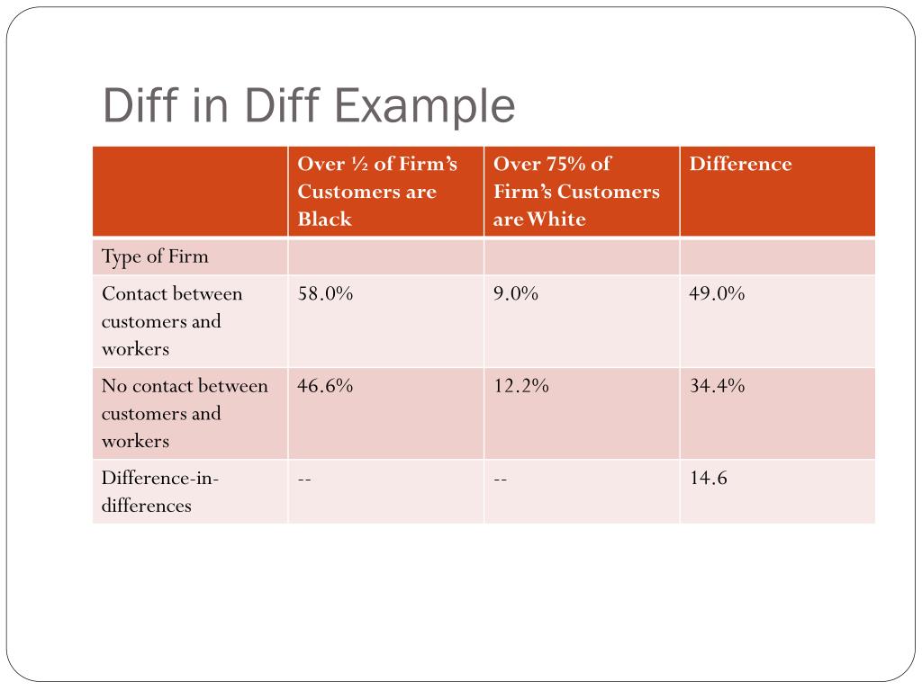 Need to compare to a control group • Important to note that the black employment gap between these two types of firms may be attributable to other factors. What if contact firms with mainly black customers are in black parts of a city… they’d be more likely to hire black workers. • Firms in survey where workers don’t have much contact can serve as a control group. • Fraction of newly hired workers who are black falls from 46.6 percent to 12.2 percent as the customer base shifts from black to white. … this is a 34.4 percentage point difference. • Because we can’t blame this on customers, this is what we’d expect to happen even if we didn’t have customer discrimination.