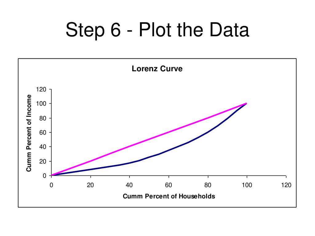 Lorenz Curve Gini Coefficient By Mike Fladlien. Income Inequality. Step 1—Raw Data. Step 2—Arrange in Ascending Order. Step 3—Find Total Income. Step 4-Find % of Income. Step 5 – Find Cumulative % of Income. Step 6 - Plot the Data. Step 7 – Find Area Under Lorenz Curve.