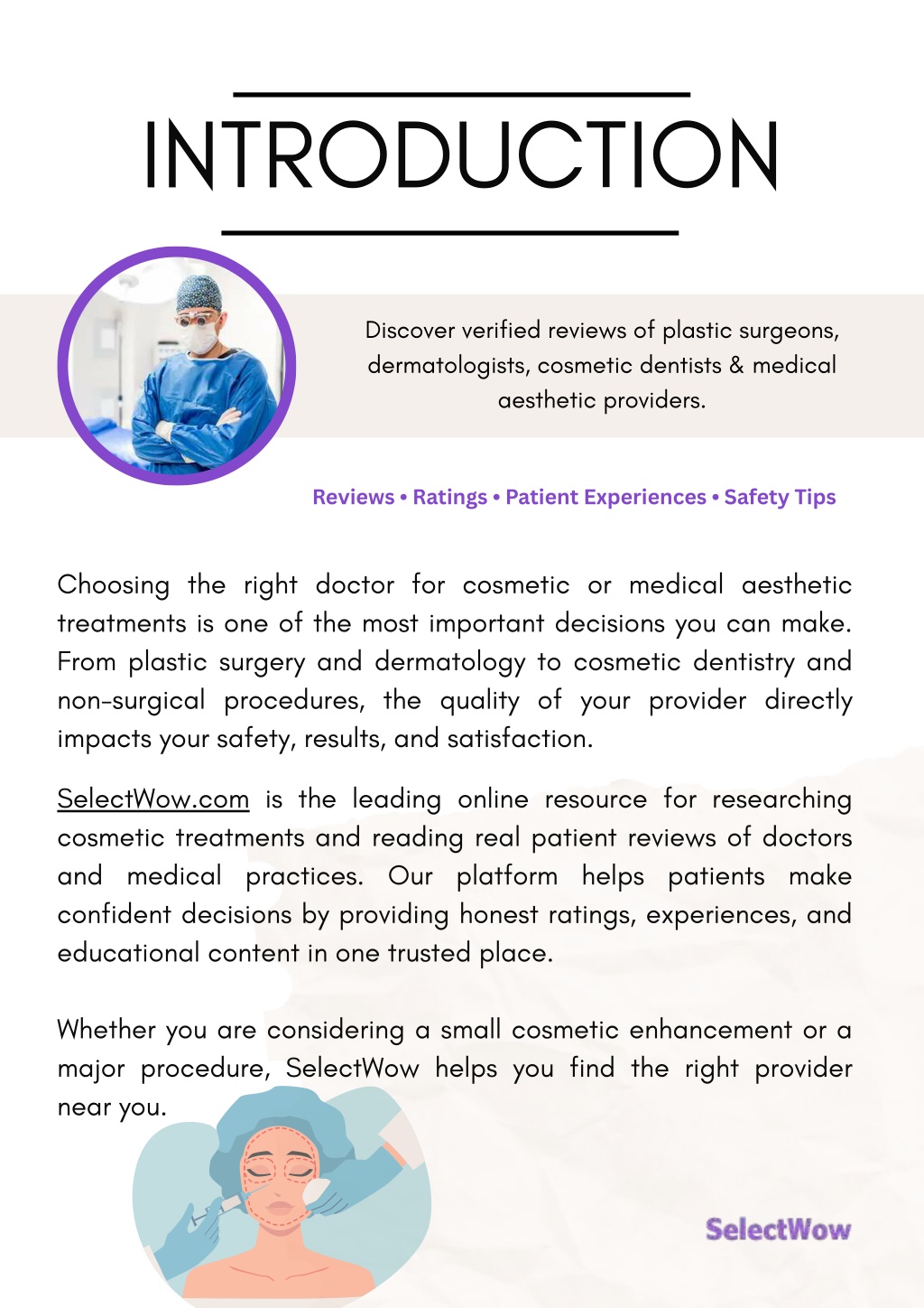 INTRODUCTION Discover verified reviews of plastic surgeons, dermatologists, cosmetic dentists & medical aesthetic providers. Reviews • Ratings • Patient Experiences • Safety Tips Choosing the right doctor for cosmetic or medical aesthetic treatments is one of the most important decisions you can make. From plastic surgery and dermatology to cosmetic dentistry and non-surgical procedures, the quality of your provider directly impacts your safety, results, and satisfaction. SelectWow.com is the leading online resource for researching cosmetic treatments and reading real patient reviews of doctors and medical practices. Our platform helps patients make confident decisions by providing honest ratings, experiences, and educational content in one trusted place. Whether you are considering a small cosmetic enhancement or a major procedure, SelectWow helps you find the right provider near you.
